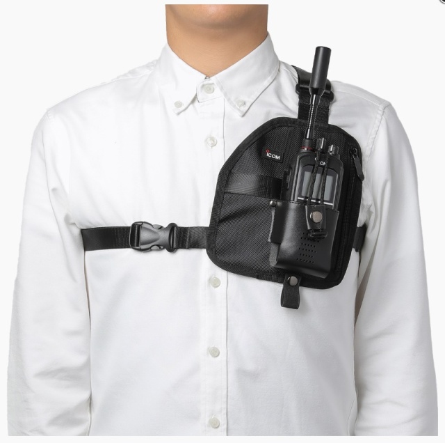 肩や脇下のベルトは、体型に合わせて調節が可能。作業着など分厚い服の上からも装着いただけます。また、胸周りのベルトの一部には、よりフィット感を高めるゴム素材を採用。ぴったりと身体にフィットするので、無線機が揺れにくく、激しい動きを伴う作業の際にも安定感があります。服にポケットが無い場合やベルトクリップが使用できない場面でも、ショルダーラジオホルダーを使えば、しっかりと無線機を装着することができます。